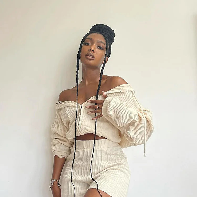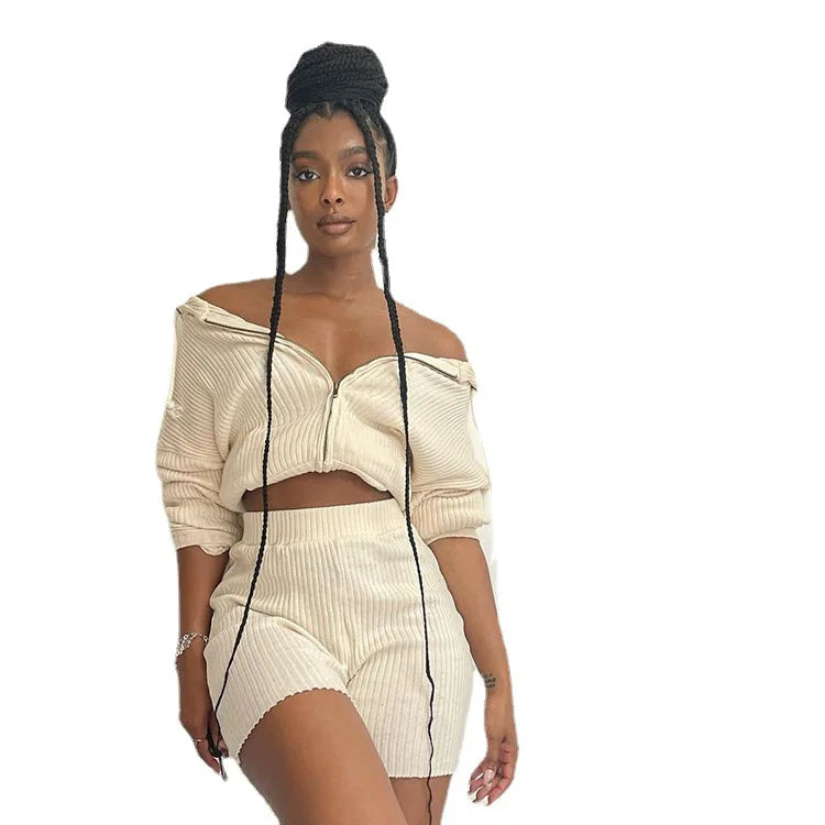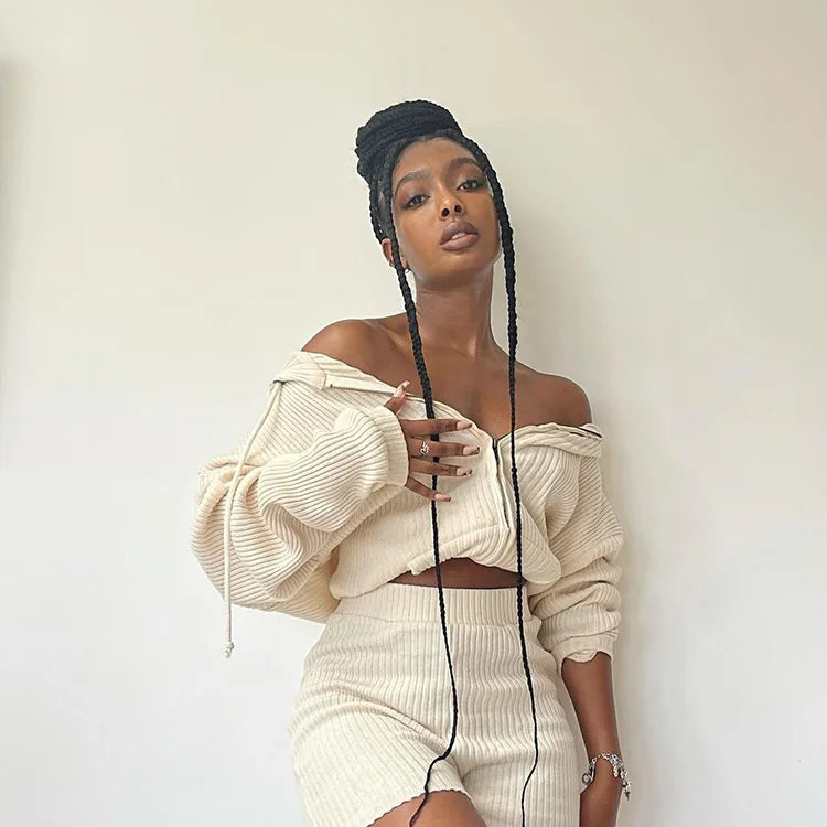 Zipper Hooded Loose Sweater Short Top Elastic Shorts Set two piece womens set 2021 sets women